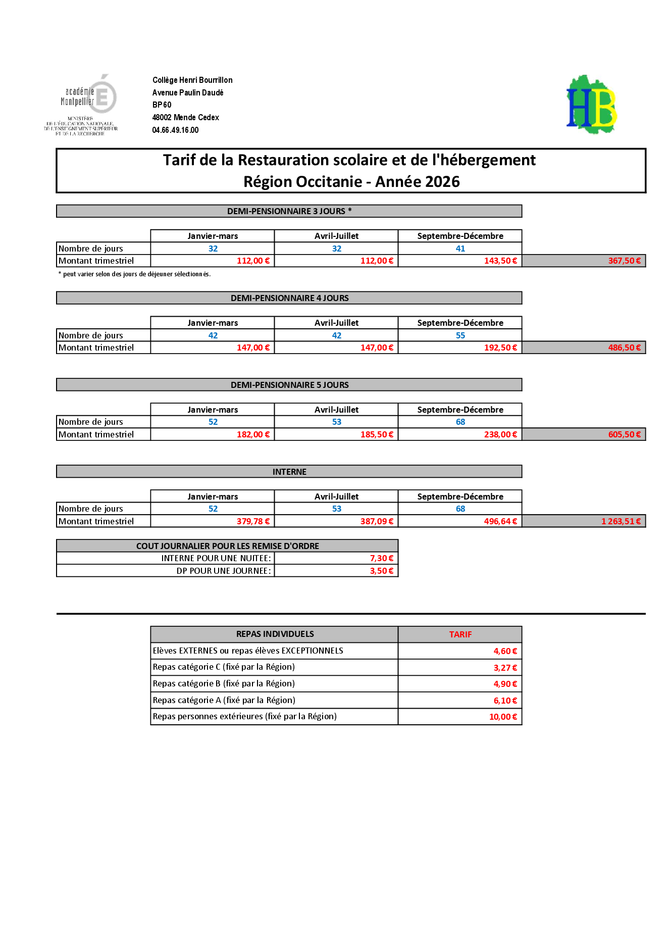 Tarifs 2026 cantine & internat