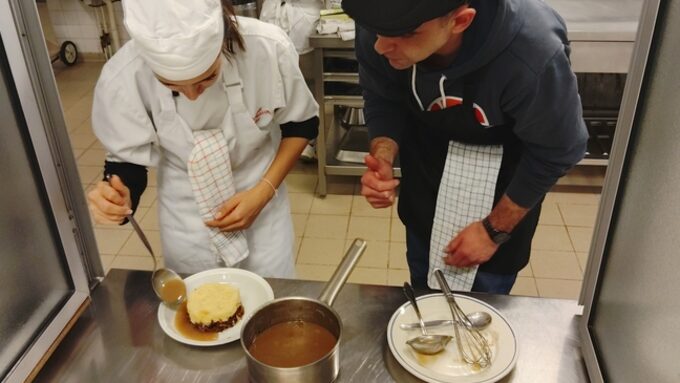 Dès 8 h du matin, les équipes de cuisiniers et de serveurs sont au travail. Leur mission : être prêts à servir les convives à 12h. Entourés de M. Grimard en cuisine et de Mme Bagagli en salle, nos élèves de 3ème SEGPA préparent entrées, plats et desserts, dressent la table qui accueillera une douzaine de clients.